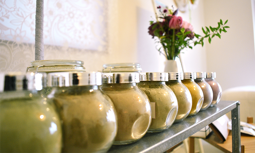 『ひとのわ』のもう1つの特徴である発酵野草蒸“BIO-STEAM”。世界で初めて開発された健康温浴法で、よもぎ蒸しに野草と無農薬の古代米を使用した発酵菌を練り込んでいるよもぎやクマザサに、玄米糀入りの8種類の野草パウダーを使用しています。モリンガやどくだみ、秋ウコン、カカオ、スギナ、柿の葉、松、ミキ(紫イモ)などのパウダーがサロンには置いてあり、カラフルで可愛らしいだけでなく香りも豊かでした。スチームで使用したパウダーを煮出した液は、持ち帰ることが可能で入浴剤にもなります。