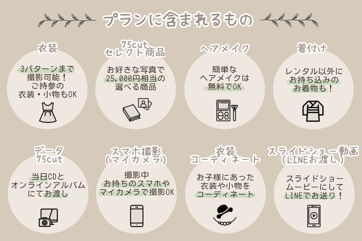 同じ服装・同じ背景で撮った代わり映えのない写真をお渡しするのではなく、たくさんのパターンを撮ることで「こんなお洋服に合うんだ!」「こんな表情するんだ!」などお子様たちの新しい発見をパパやママにしていただきたいという思いから生まれた大満足のプラン内容。