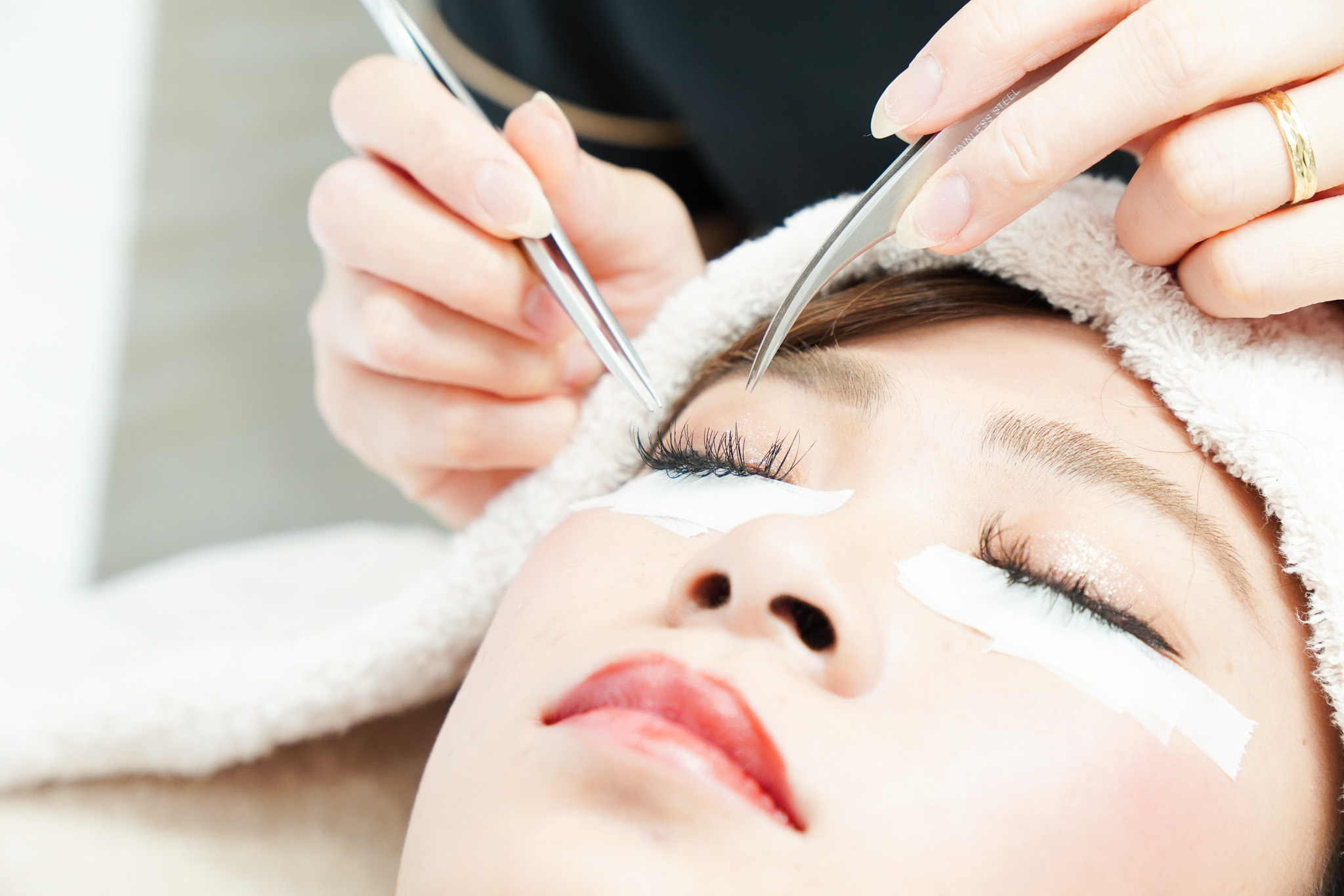 Beauty Salon Nine』では「ボリュームラッシュ」と呼ばれるエクステを使用。細い毛を3束から5束ほど、1本の自まつげに装着していきます。