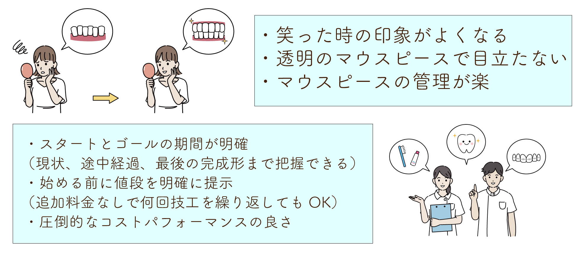 治療前のカウンセリングで価格が明確に提示されているため、追加料金などは取られることなく技工を何度でも繰り返すことができます。