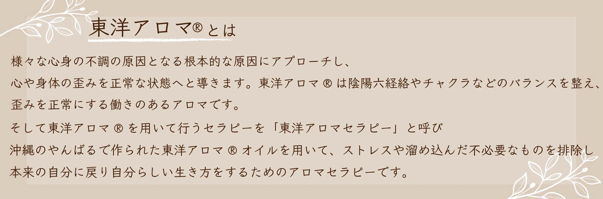 そのためアロマトリートメントの施術には東洋医学的観点により漢方理論に基づきブレンドされた「東洋アロマ®」を使用し「東洋アロマ®セラピー」をされています。